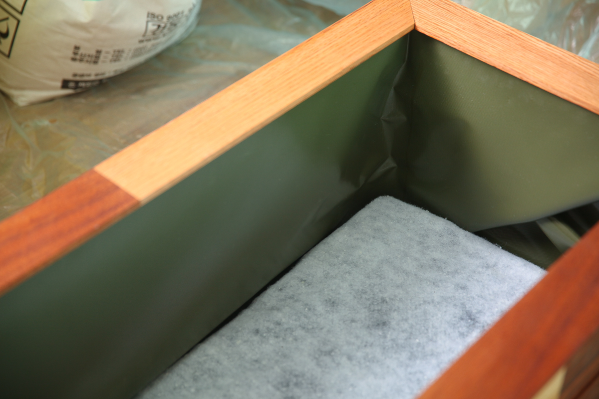 내부에 타포린 방수시트가 되어있어 목재가 썩거나 물이 새어 나올 걱정이 없습니다.